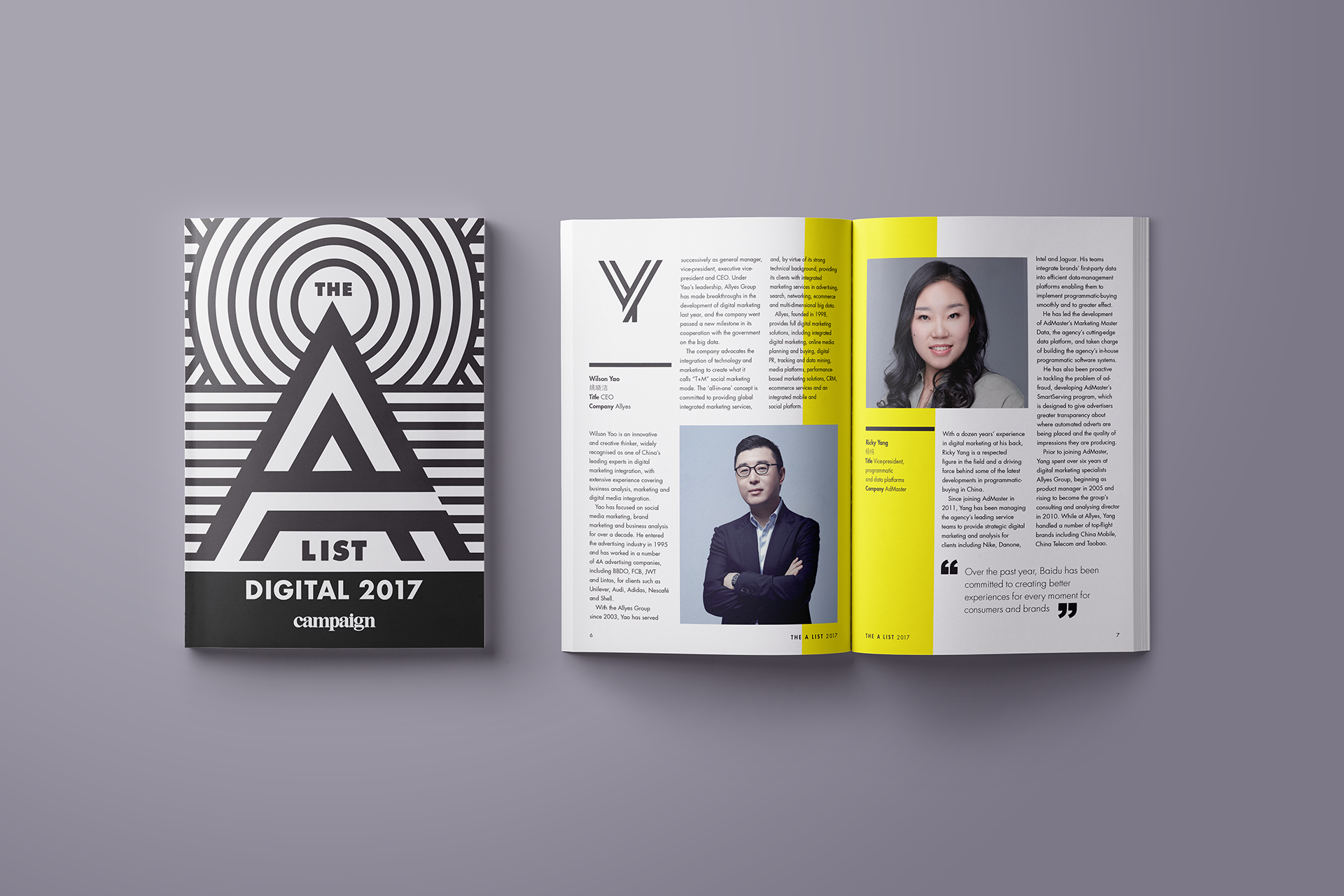 Designed around an award format, The A List recognises the achievements of the top hundred individuals in China's media and digital marketing industries. I was tasked with creating an illustration for the event branding and directory. This modern Art Deco-style design complements The A List’s youthful and premium positioning. And it stands out!